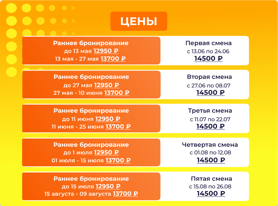 Стоимость смены от 12950 рублей при раннем бронировании!