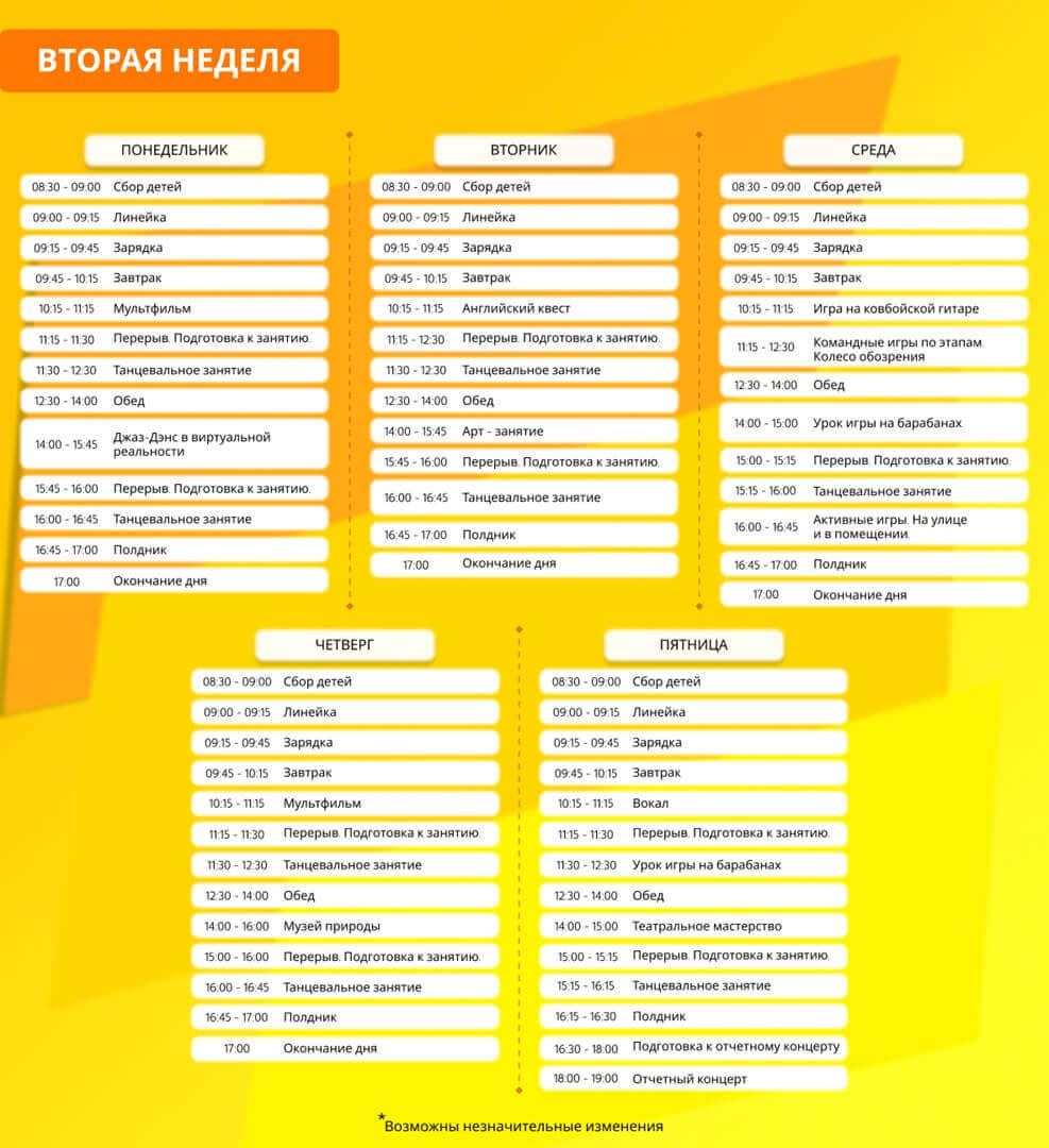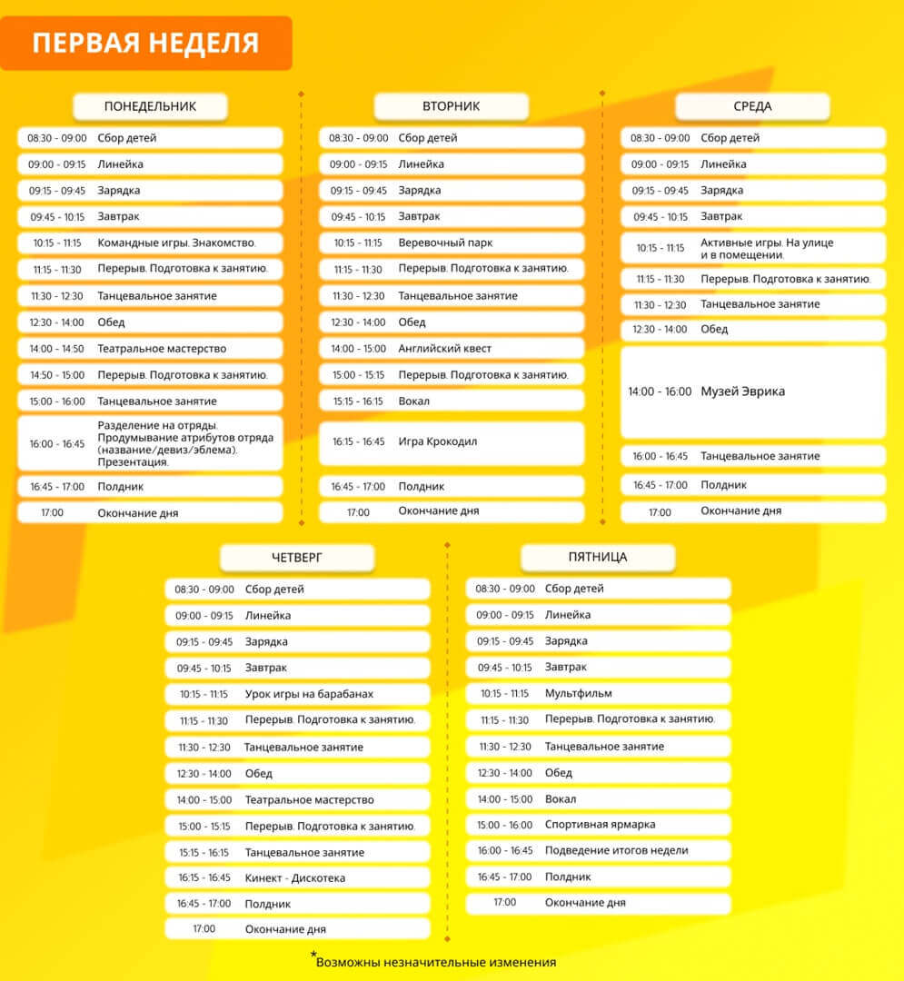 Режим работы лагеря с 8:30 до 17:00 с понедельника по пятницу, в течение 2х недель.